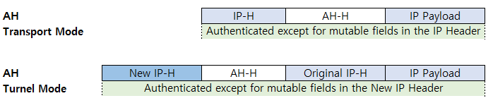 - AH(Authentication Header) : 메시지 인증 코드(MAC)와 암호화를 이용하여 송신처 인증 제공