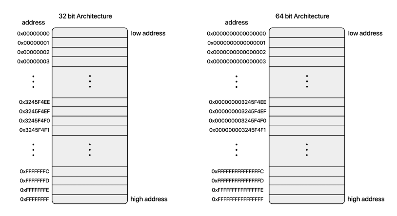 32๋นํธ๋ 0000 0000 0000 0000 0000 0000 0000 0000 ๊ณผ ๊ฐ์ด ๋ํ๋ผ ์ ์๋ค. ์ด 32๋นํธ์์ ๋ํ๋ผ ์ ์๋ ๋ชจ๋ ๋ฐ์ดํฐ ์ฒ๋ฆฌ ๋จ์์ ๊ฒฝ์ฐ์ ์๋ 2³² ์ด๋ค. ๋ํ ํ๋์ ์ฃผ์๊ฐ 32๋นํธ ์ด๋ฏ๋ก 4byte์ ๊ธธ์ด๋ฅผ ๊ฐ์ง๊ฒ ๋๊ณ , 1byte์ ํฌ๊ธฐ๋ฅผ 4,294,967,296 ๊ฐ์ ์ฃผ์๋ฅผ ๊ฐ๋ฆฌํฌ ์ ์๊ฒ ๋๋ค. ๊ทธ๋ฆฌ๊ณ ์ด๋ 4GB๋ฅผ ๋ํ๋ด๊ฒ ๋๋ค.