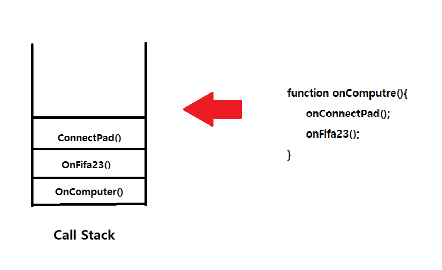 작업 순서를 지정해주는 호출 스택(Call Stack)도 존재한다. 호출 스택은 메모리 힙에서 할당한 작업들을 실제로 사용을 할 수 있게 도와준다. 만약 누군가 정의해둔 함수를 우리가 실행한다면 메모리 힙에서 저장해놓은 정보들로 함수 단위로 하나씩 쌓아가면서 가장 나중에 올라온 데이터를 먼저 수행한다(FILO). 이때 수행된 명령어들은 하나씩 사라지게 된다.