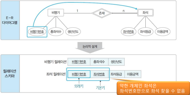 - 약한 개체의 기본키로는 릴레이션 관계가 성립되기 어렵기 때 외래키를 포함해서 기본키로 지정한다.