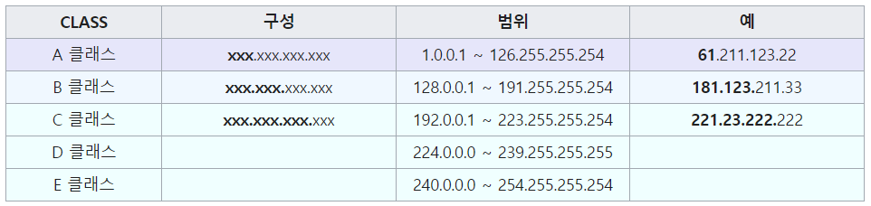 IP 주소 첫번쨰 옥텟이 1~126 (127은 루픅 배주소라 불리는 예약된 주소) 범위의 IP 구성을 가지는 클래스로, 가장 규모가 큰 클래스이다.